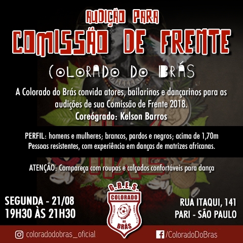 ATENÇÃO, a Colorado do Brás convida atores, bailarinos e dançarinos para as audições de sua Comissão de Frente 2018.
